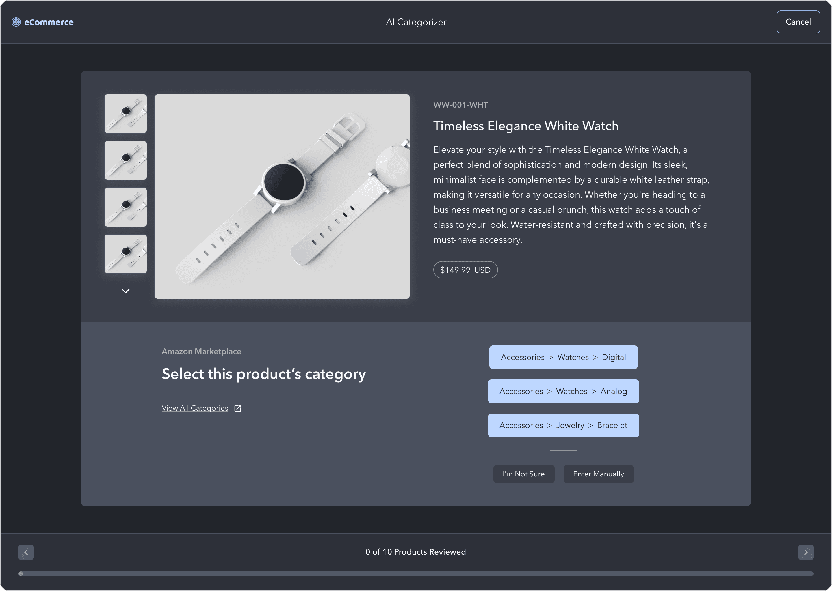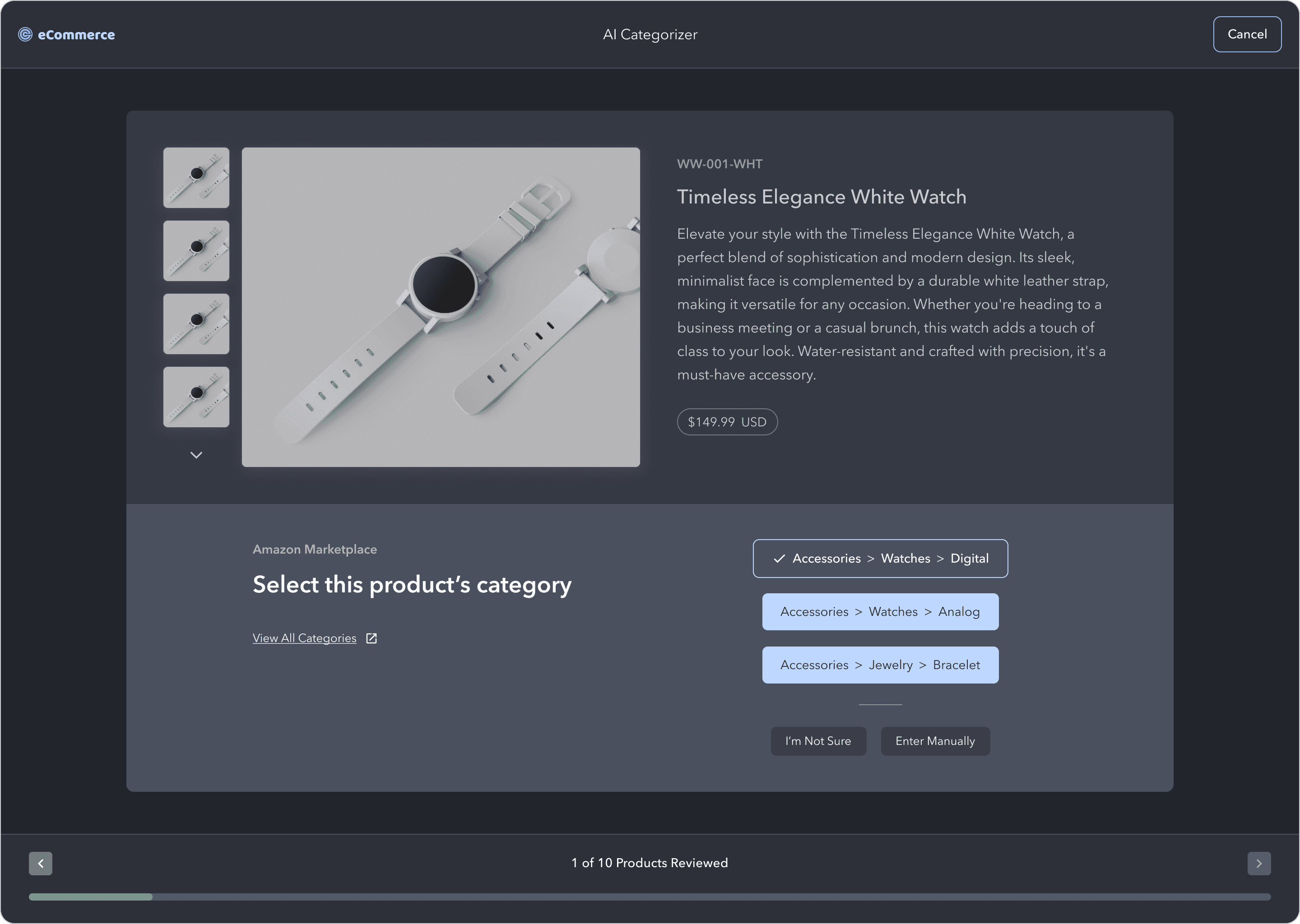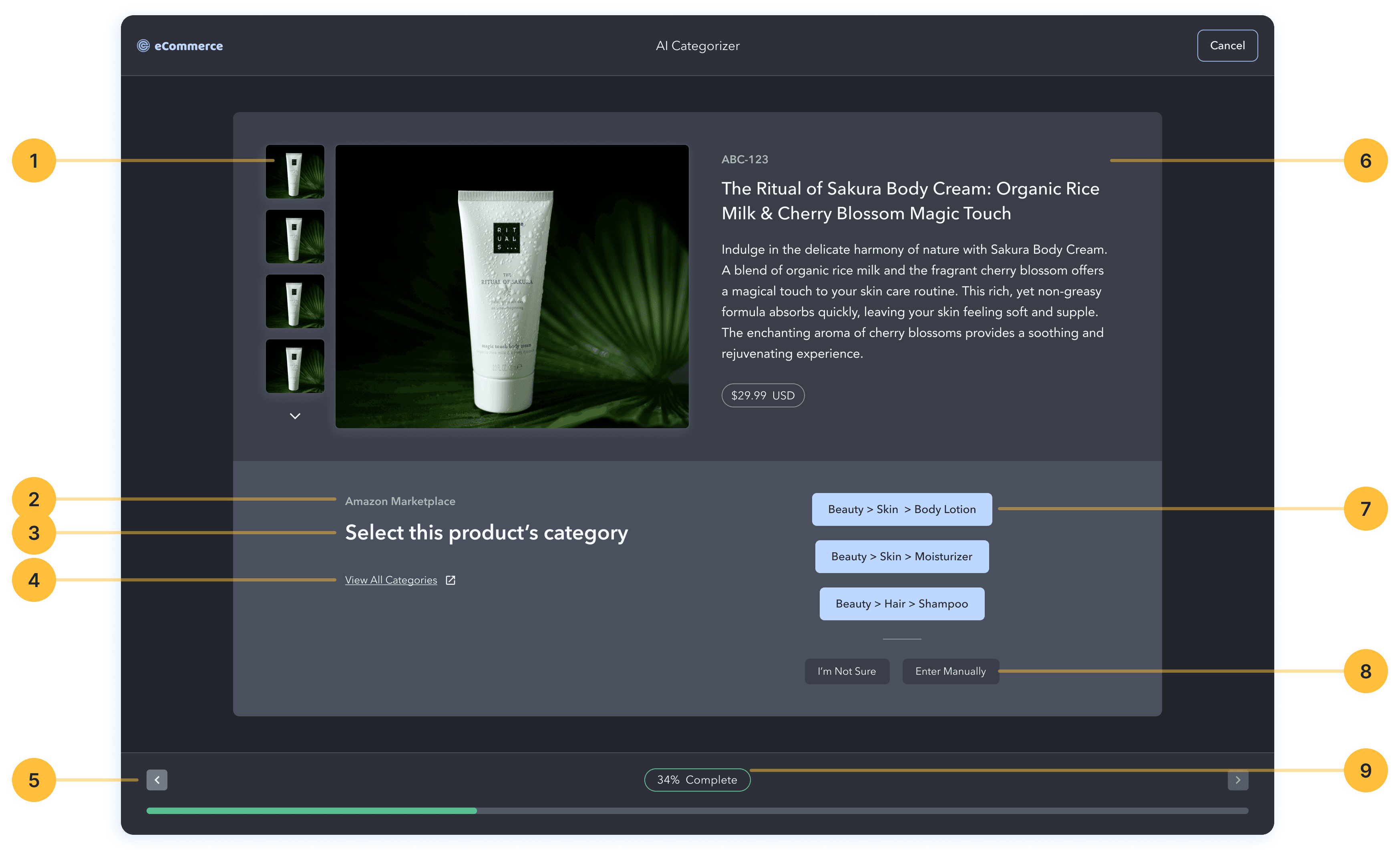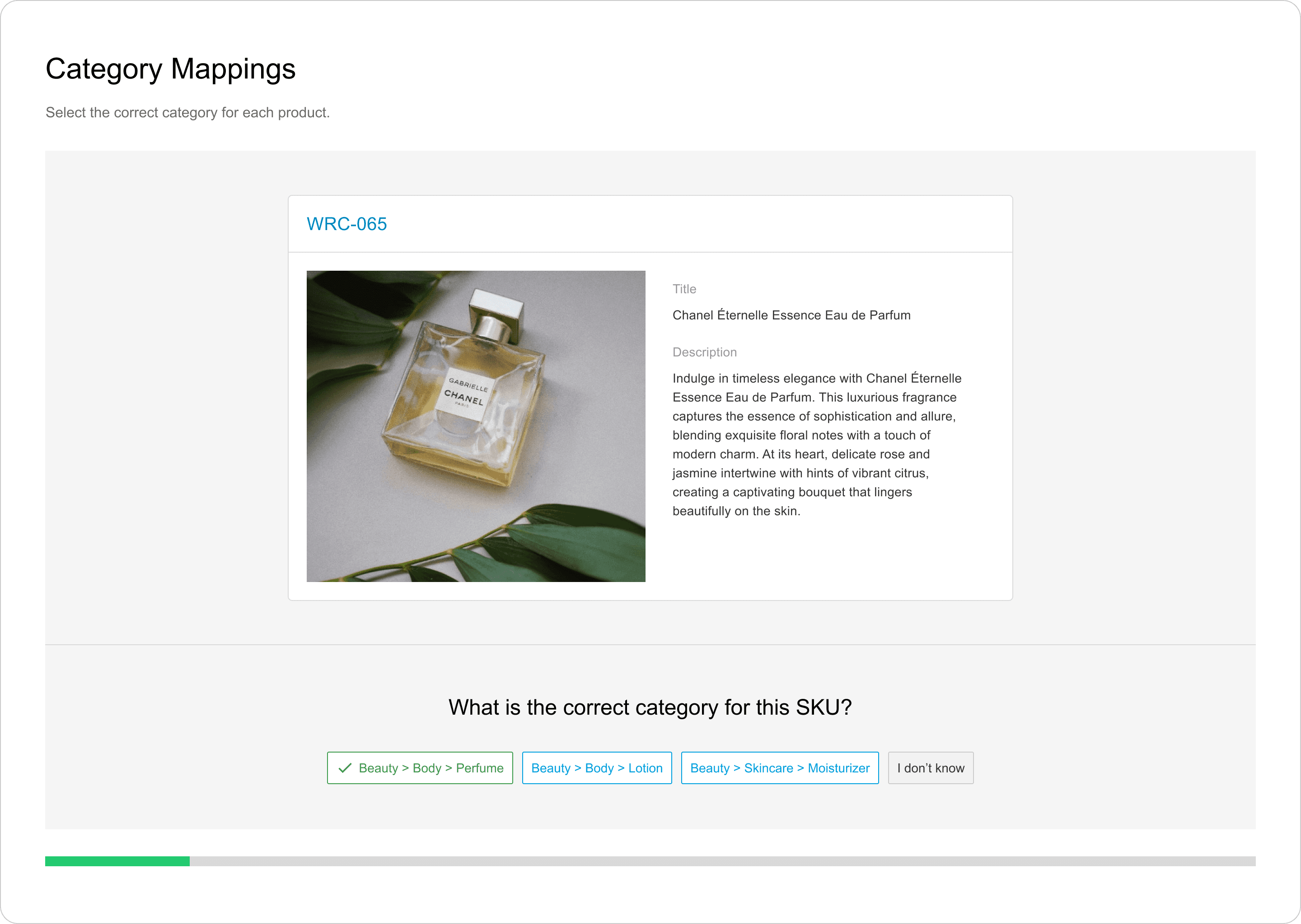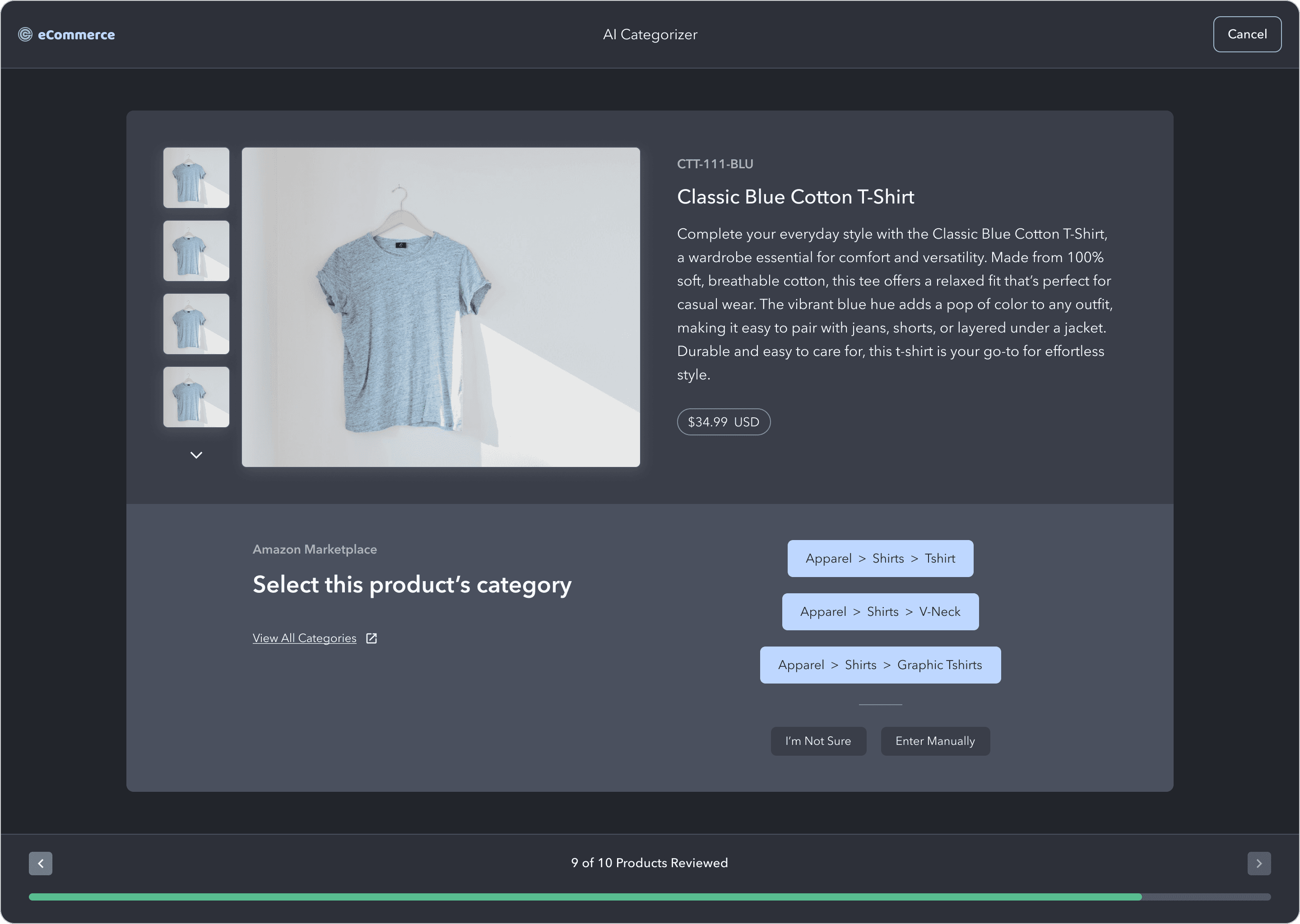 This is where users review each product and select the correct category to train the AI model. The product image is front and center, and there's more product data if the user needs it.
