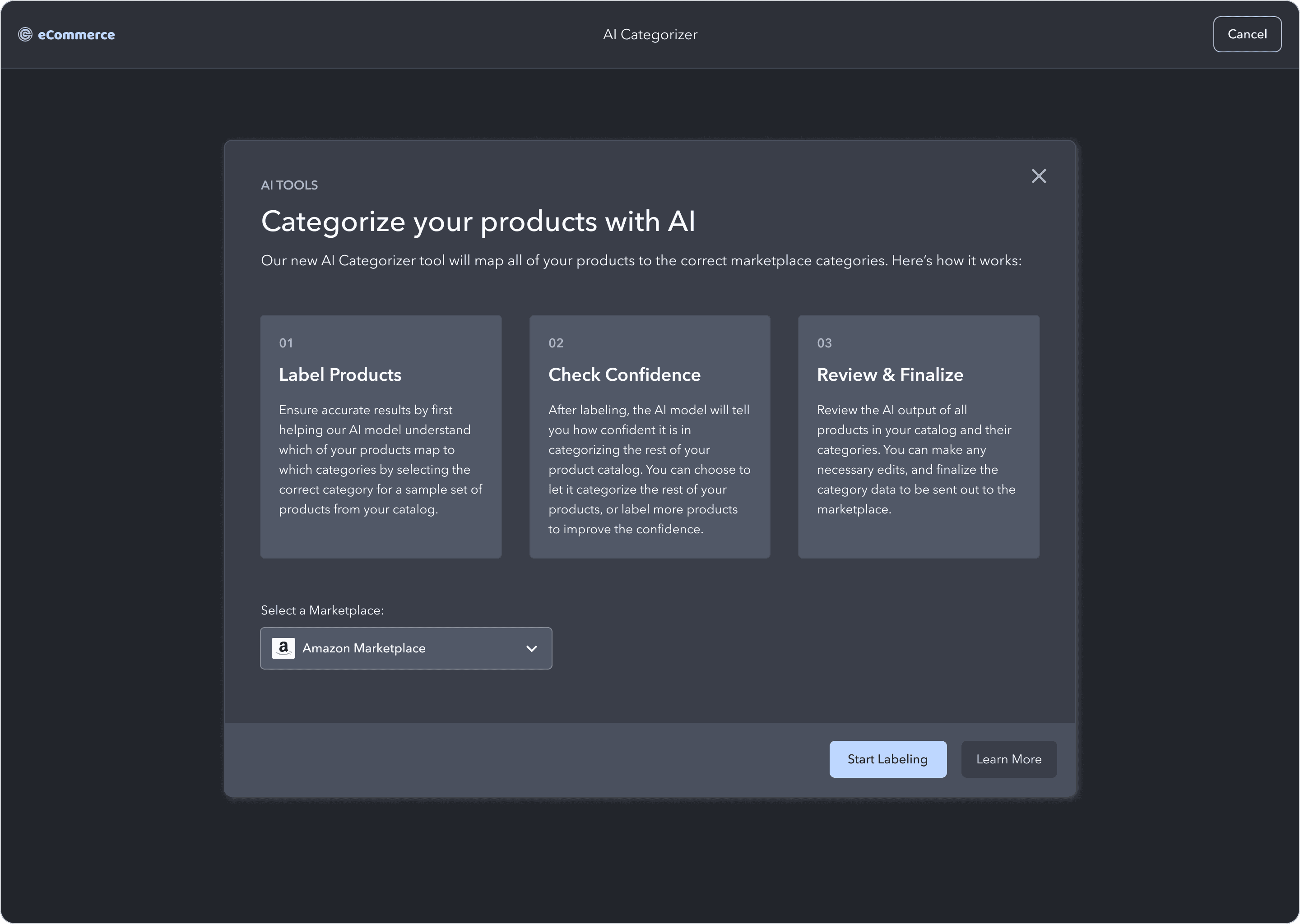 The AI model will analyze the input (the user's product data), categorize products according to the marketplace's requirements, and assign a confidence level to each category mapping.