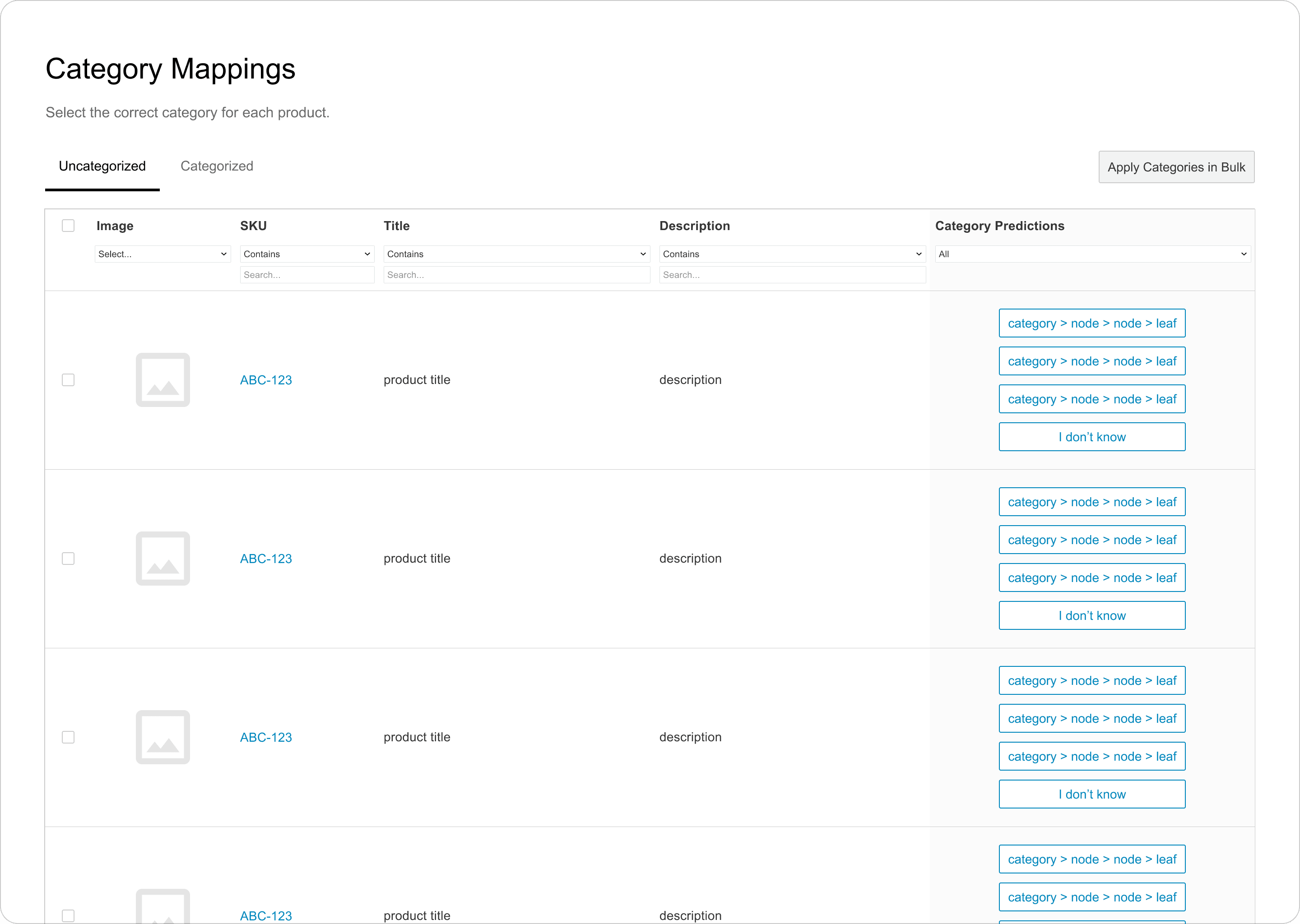 All of the wireframed options above essentially boiled down to 2 main approaches: users either select the category for products one by one, or in bulk via a list of all products to categorize.