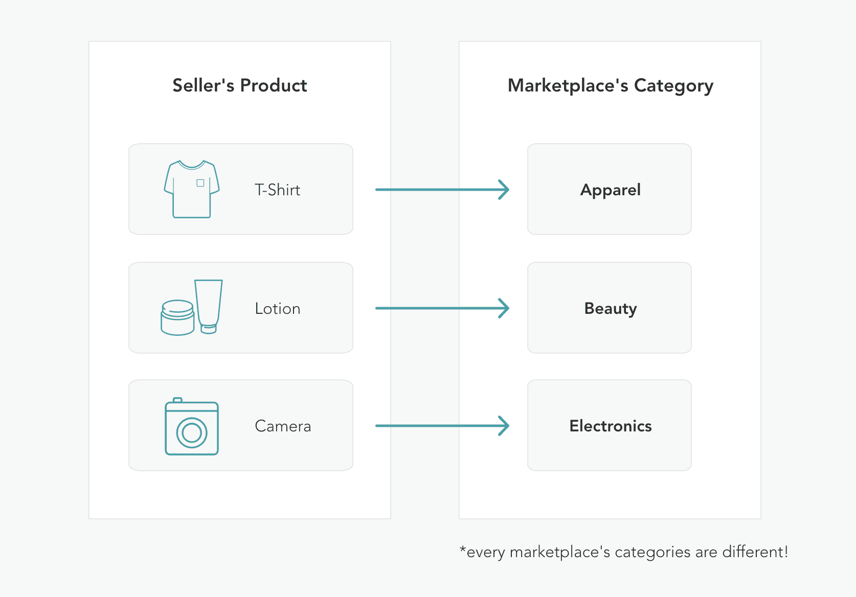 Category mapping is the process of identifying and labeling the appropriate marketplace category for each of a seller's products. To list their products on a marketplace, sellers must assign a specific data point to each product indicating its category.