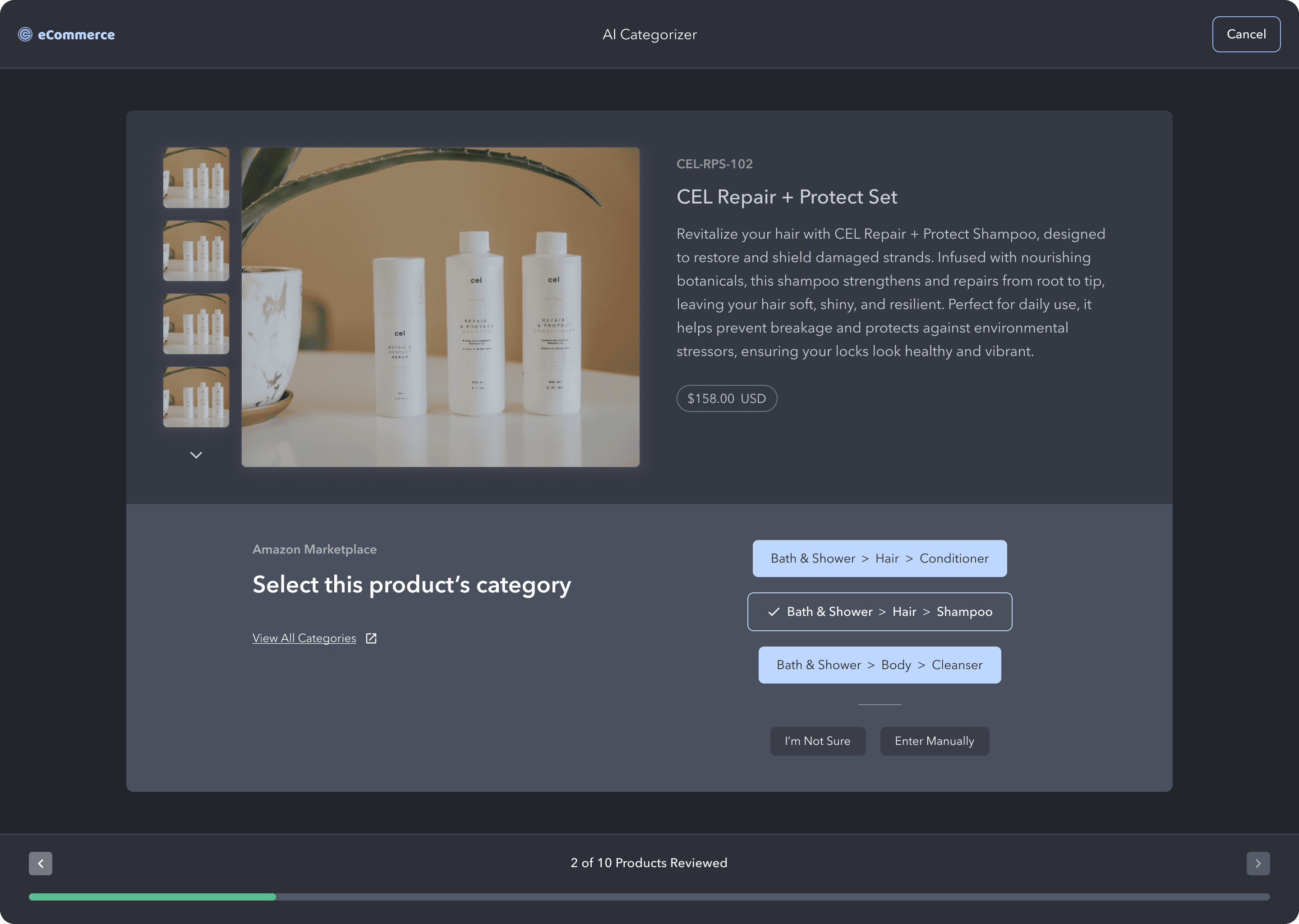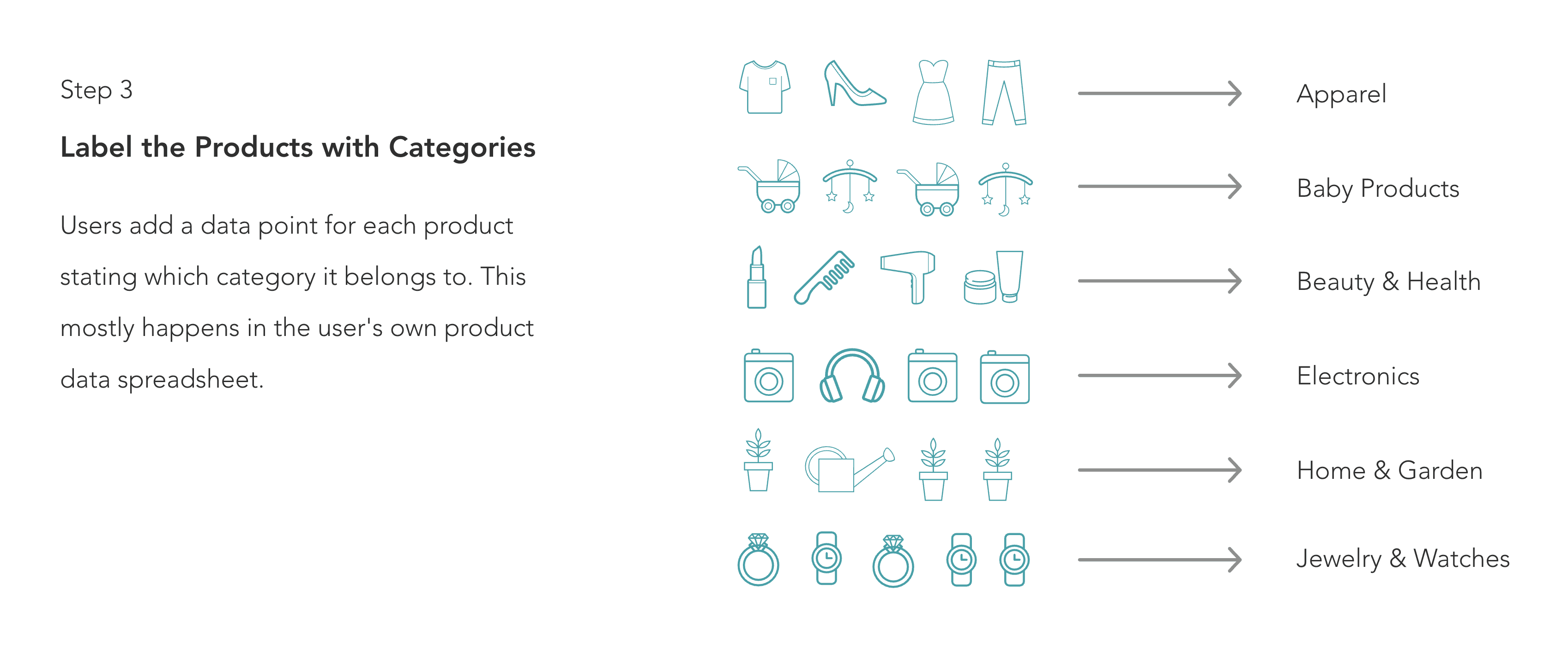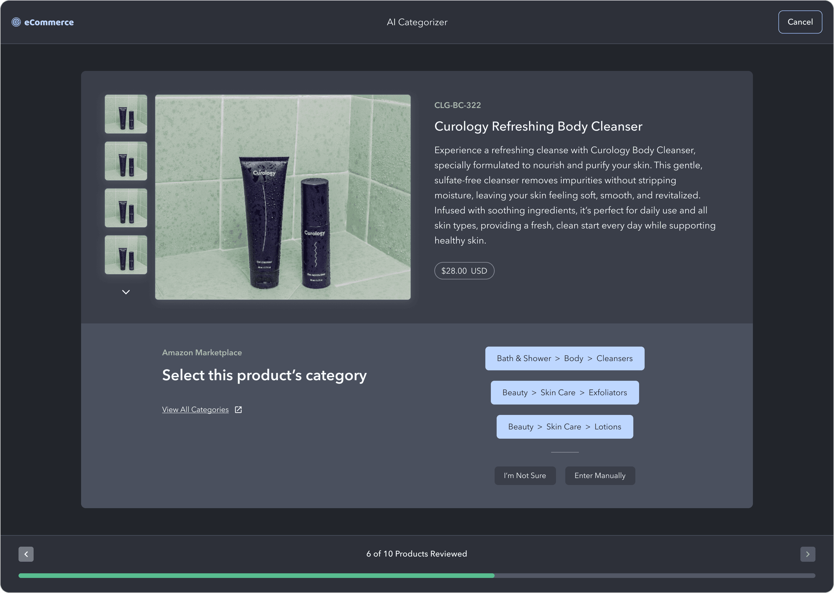 If the model is not confident in a product's category mapping, it will surface that product and the user will manually select the correct category for the product. The model will learn from this input and apply the knowledge to other similar products.