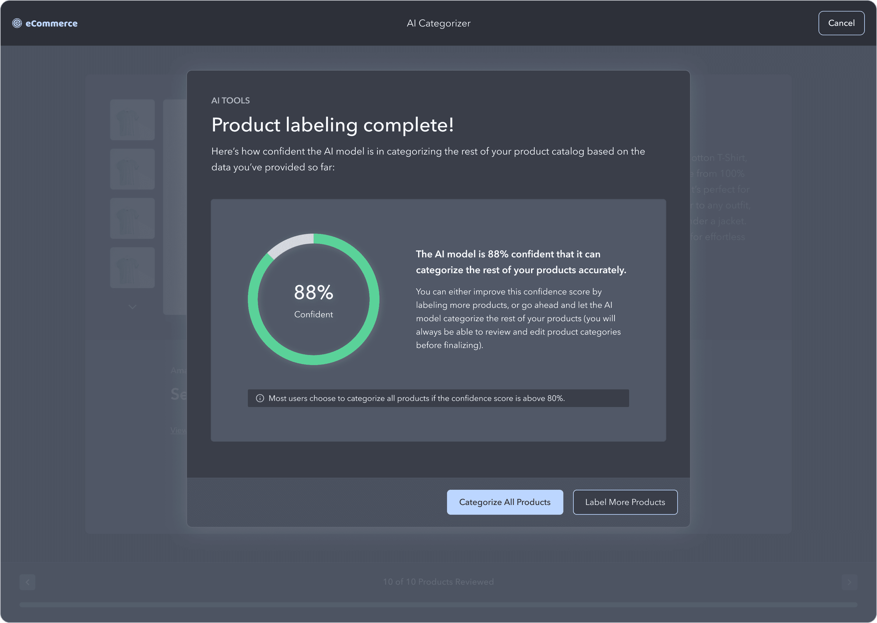 After completing the labeling of this set, the user will receive a confidence score indicating how confident the model is in labeling the remaining products in their catalog. The user can then choose whether to let the model proceed with labeling the rest of their products or to label additional products to improve the confidence score.