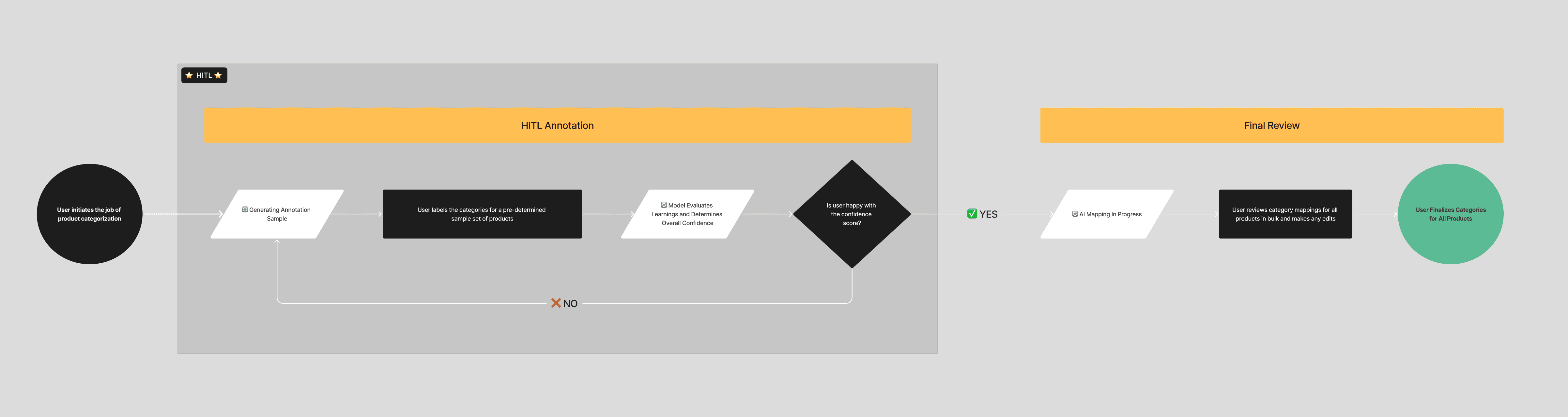 Collaborating with our data science team, we discovered that implementing a machine learning model for category mapping could significantly reduce our users' time and effort. Initially, the model would require human input through a Human-in-the-Loop (HITL) experience. Here's how it works:
